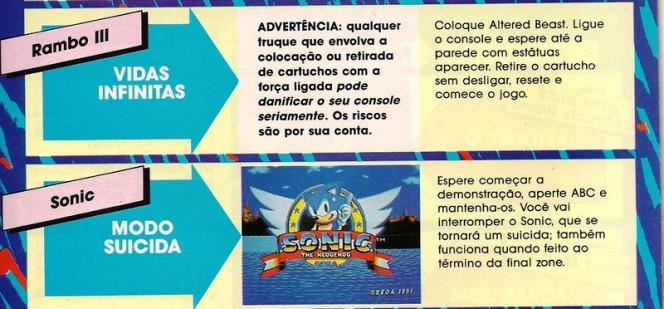 Enfim, o problema é quando uma coisa dessas aparece em uma revista que era vendida no Brasil todo (tá, em QUASE todo, no norte era um parto conseguir uma dessas), e com a receita de como fazer a coisa! Eis aqui lhes apresento a dica mais perigosa de todos os tempos, para ser executada em qualquer Mega Drive, segue: