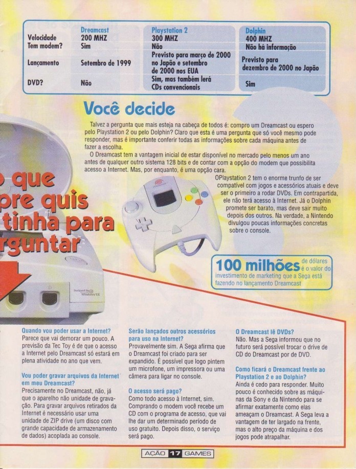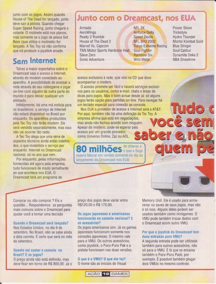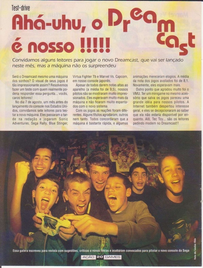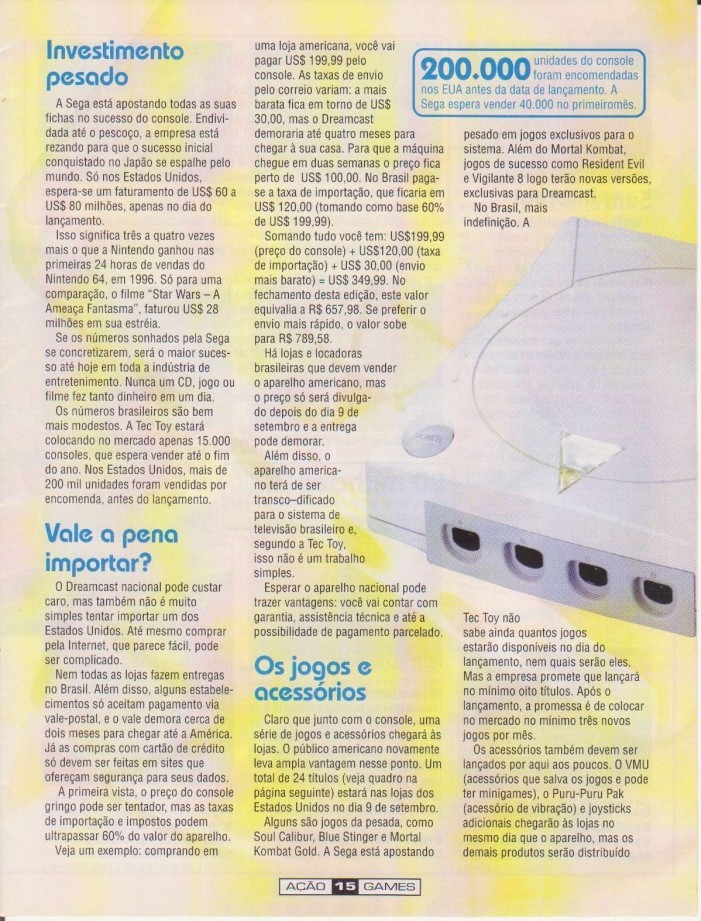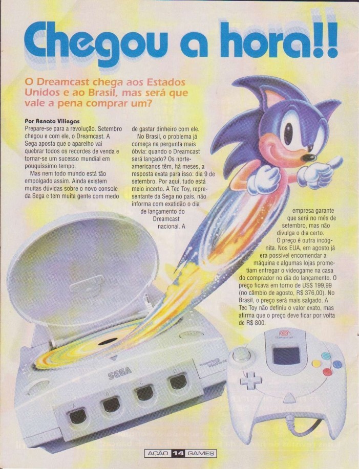O melhor de tudo é que a Tec Toy prometeu o lançamento do Dream no Brasil tambem, porém com uma entrada bem mais modesta. Poucas propagandas, preços altos, falta do console em várias lojas e cidades... Muita gente comprou o Dreamcast nacional, mas muito mais gente o comprou a versão americana vendida em feiras e lojas de eletronicos independentes. E não era de se condenar, o console da Tec Toy chegava nas lojas sem modem, com um preço altissimo (R$ 800,00 numa época em que o salário minimo era de míseros R$ 136,00) e com a única vantagem de ser possivel dividir o valor da compra em mil parcelas no carnê das Casas Bahia e 1 ano de garantia, além do que, como mencionei, não havia tantos consoles disponiveis por aí, só nas principais capitais e nas grandes lojas mesmo. Enquanto isso, nas maiores feiras de todo o pais, era possivel comprar a versão americana do Dream que vinha com o modem de 56kb e custava muito menos (por volta dos R$ 500-600), sem falar que tambem muitas vezes era possivel comprar o aparelho dividindo o valor no cartão de crédito por exemplo.