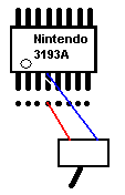 Você tambem pode optar por instalar um switch ali naquela perninha do 4º pino que foi cortada, unindo-a ao ponto correspondente dele na placa mãe do console. Assim, se algum jogo original teimar em não funcionar no NES, é só mudar a chave do switch para abilitar o funcionamento do autenticador, e o NES passará a se comportar como antes com jogos originais e falsificados. Veja o diagrama abaixo, onde ilustro como seria a instalação de um switch nesse chip.