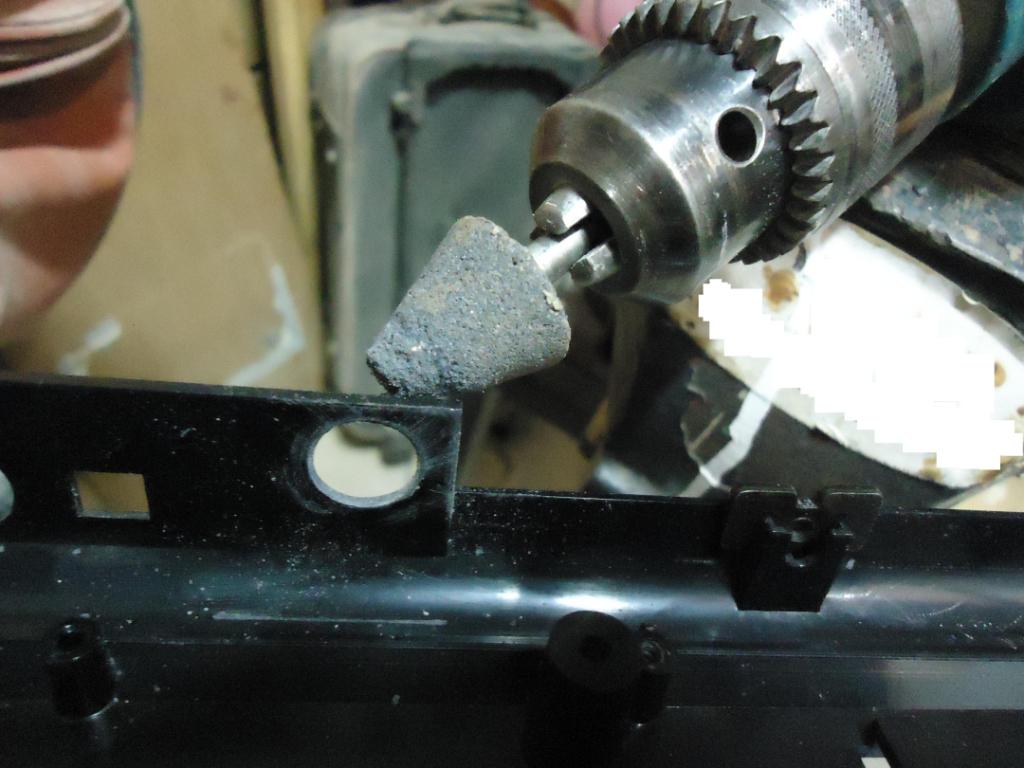 No meu caso, logo que decidi onde instalar o plugue, coloquei uma fita adesiva verde com um furo no meio para me orientar na hora de fazer o orificio. A maneira ideal de se fazer um orificio desses num console é usar uma miniretifica. Porém, como esse negócio é meio carinho e quase ninguem tem, você pode usar uma furadeira com controle de velocidade. A maioria das furadeiras tem um gatilho com esse tipo de controle, e funciona mais ou menos como um acelerador, se você pressionar de leve, a broca irá girar bem devagar, e conforme se aperta o gatilho, a velocidade de giro aumenta.