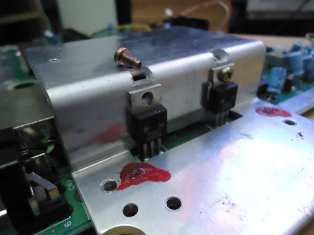 Agora que o conector já tem seu lugar definido e preparado, falta o principal, que é soldar os fios e componentes da maneira correta. O chip que recebera os fios, é o Sony CXA1145p. Sabe aquela peça de metal que fica bem ali perto da saída de video do console? Pois é, ela serve para dissipar o calor produzido por dois transistores e tambem esconde esse chip. Essa peça é parafusada aos transistores e a placa mãe. Desparafase-a, e remova-a com cuidado para não entortar os transistores: