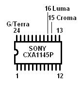 Se você notar bem, na imagem acima ha alguns numeros que indicam o pino 1, 12, 13 e 24 desse chip. Iremos soldar 3 fios, um no pino 15, outro no 16 e o ultimo no 24. O pino 15 é o que dá o sinal de chroma, o 16 é o sync e o 24 o terra. Veja a imagem abaixo, ela ilustra onde estão os pinos que nos interessam: