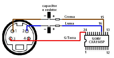 Agora, pegue o conector S-Video, e solde o polo negativo de cada conjunto de capacitor/resistor, nos pontos correspondes aos de nº 1 e 2 do conector: