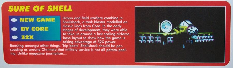 A noticia do lançamento da versão do Shell Shock para o 32X saiu em algumas revistas sem muito alarde no inicio, mas com a promessa de mostrar todo o poderio do acessorio. Pena que não há nenhuma rom sequer do projeto inacabado desse game para o 32X, mas é possivel que o game seria praticamente o mesmo, claro excetuando apenas os efeitos sonoros e a resolução menor dos gráficos, mas de resto seria o mesmissimo Shell Shock que conhecemos sem muitas novidades. Abaixo, recorte de um scan do anuncio do game em uma revista: