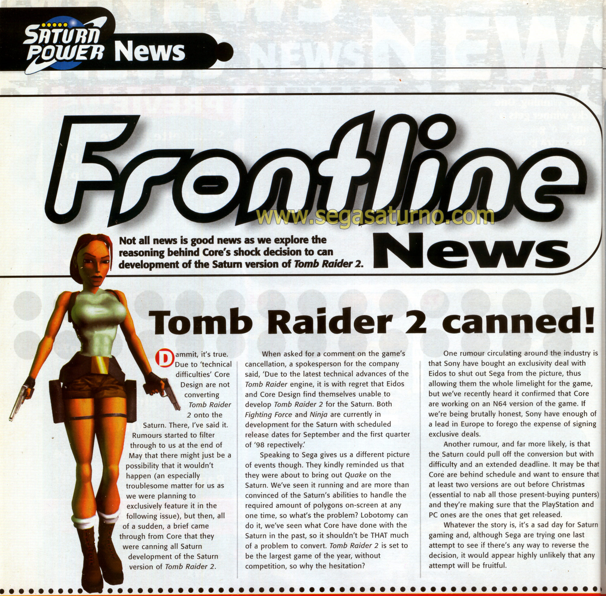 A Core até havia anunciado a produção do Tomb Raider 2 para Saturn sem nenhum problema. O console tinha capacidade e havia provado isso em muitas ocasiões, era muito melhor que Praystachion e Nintendo 64, e a primeira versão de Tomb Raider foi lançada com sucesso e louvores para o Saturn, não podendo dessa forma existir qualquer desculpa para um cancelamento da segunda versão do jogo. Mas como sempre, algo tinha que acontecer.