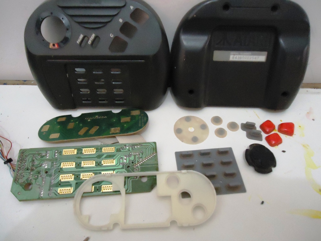 É... pelo jeito o problema deveria ser só sujeira. O controle do Jaguar é bastante diferente por dentro tambem, as borrachas dos botões de cima são presas por uma peça de plástico que as mantem no lugar devido em cima da placa, e as placas são presas por parafusos no plástico do controle. Beeeeeeem estranho... mas vá lá, já esperava algo esquisito assim (ainda mais depois que desmontei o Jaguar