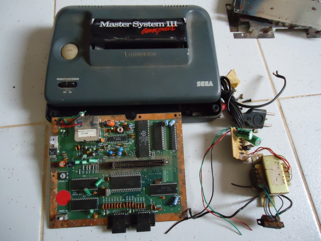 Esse Master chegou até mim junto com um outro, e vieram praticamente a titulo de doação. Resolvi escolher este para fazer esse artigo, pois o outro apesar de estar até um tiquin mais sujo, não apresentava a mesma dificulcade que este apresesenta, pois apesar de por fora os dois serem iguais, por dentro este se mostra um dos primeiros modelos de Master 3 (com placa mãe maior, fonte, fios, chapas de metal...) enquanto que o outro se resume a apenas uma plaquinha simples e uma fonte capenga parafusada no plástico do console.