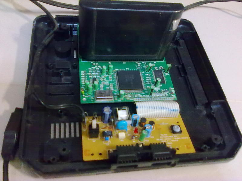 O console é daqueles mais novos, onde tudo é simplificado e a placa é minúscula. É possível perceber que não tem uma fonte de alimentação separada, o circuito transformador de tensão é feito principalmente através de um conjunto de diodos e conta com um mini transformadorzinho que já está barulhento por sinal. Nota-se que essa "fonte" está embutida na mesma placa que recebe os conectores dos controles.