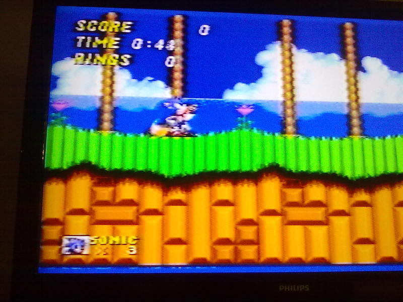 Após uma boa lavagem, um pingo de solda e um ajuste na imagem através de um trimpot, para a minha alegria o Mega ligou e funcionou meia vida (com uns tiltinhos esporádicos na imagem, mas nada que atrapalhe a jogatina).