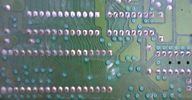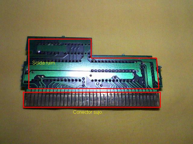 Se quando você inspecionar a placa do cartucho ver trilhas corroídas por oxidação, será necessário refazê-las com uma lamina ou lixa. Raspe por cima da trila corroída para ver onde ela esta partida e com um ferro de soldar e solda, com muita paciência e atenção, encoste o ferro na trilha e em seguida a solda e mova à ponta do ferro de uma ponta a outra da trilha partida ate que fique uma trilha de solda preenchendo a que antes estava partido.