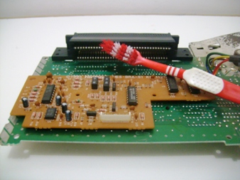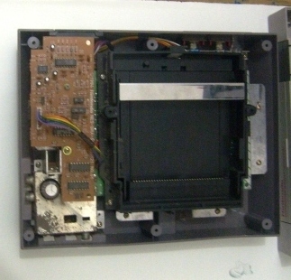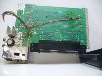 A parte da fonte de fato havia sido danificada por algum dos ultimos donos dele, o console tambem estava mal encaixado e sem a chava metálica superior que cobre a entrada do cartucho. Essa parte metálica na verdade, não faz falta alguma, ela tando lá ou não, dá na mesma. Porém, há uma peculiaridade nesse NES da Playtronic, que é uma placa adicional (a da foto da direita) que serve para transcodificar a imagem do console de NTSC para o PAL-M usado nas televisões brasileiras. Há vários fios soldados em diversos pontos da placa mãe do NES e que compõem o cabo que é ligado nessa placa. Na foto não dá pra perceber muito bem, mas a situação da plaquinha estava lastimavel... muita poeira em todo canto.
