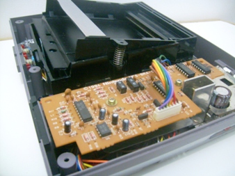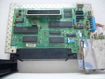 A placa mãe do console estava incrivelmente bem, sem sujeira, restos de barata ou qualquer coisa do tipo. Esse console tambem não foi destravado, o que o faz funcionar somente com jogos originais. Há um adesivo nela dizendo "NTSC", isso porque esse console foi importado pela Playtronic, tendo um ou outro componente do pacote que formava o console fabricado por aqui, como a caixa e os manuais hehehe, o resto vinha do Japão mesmo. Notem abaixo como estão soldados os fios que são conectados na plaquinha que converte o sinal de video.