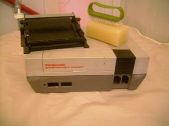 Daqui pra frente, o processo de limpeza foi o mesmo adotado na limpeza de diversos outros consoles. Basicamente, é preciso usar sabão, água, escova de dentes, pincel, alcool, água, esponja, água, sabão, mais água, e pra garantir, mais sabão e água. Primeiro, limpeza de partes plásticas, e lá fui eu limpar a carcaça do Nintendinho.
