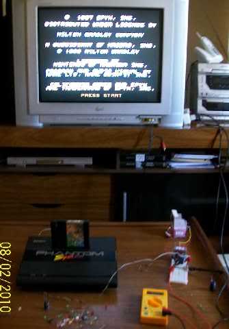 Primeiro teste: tela azul! Oh oh.. Tela azul?? Isso aqui não é Windows!! Não me lembrava de tela azul quando não pegava cartucho. Estava receoso, mas arrisquei mais um pouco, recolocando o cartucho (adivinhem qual...). Pelo menos o LED estava aceso. De repente..... UAU!!!!!!!!!!!!! Eu não achei que ele voltaria a funcionar depois de 15 anos parado!!! Valeu, GIGA!!!!!!