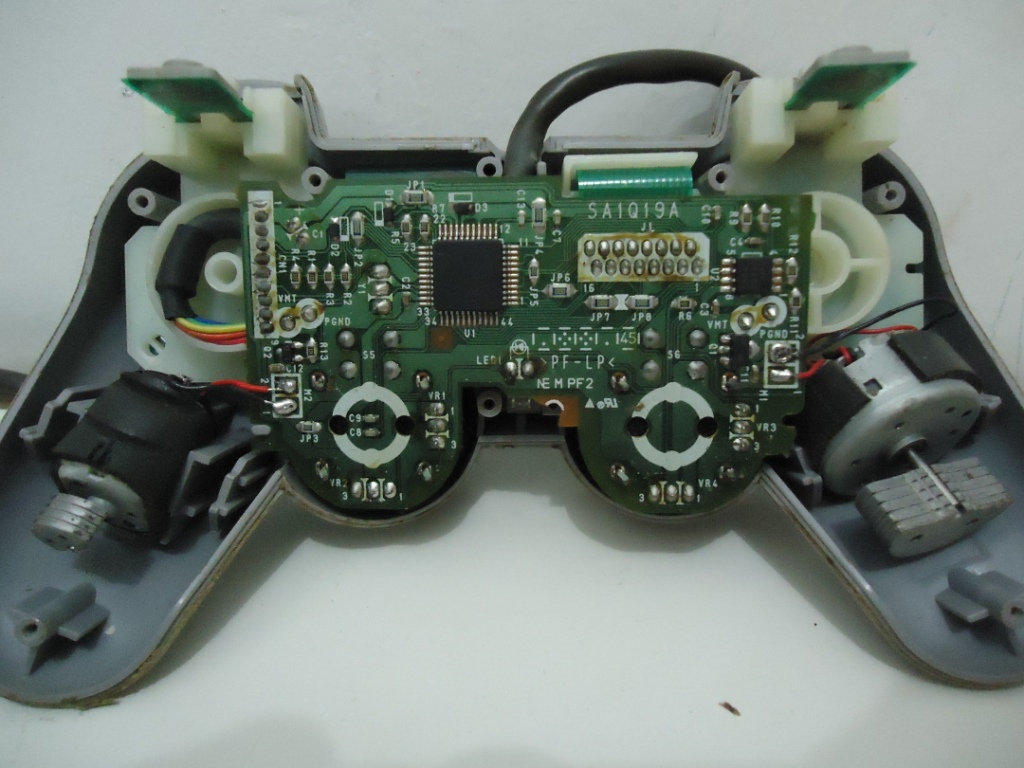 O controle em si, quando conectado ao video game, apenas ligava aquela luzinha do analógico e nada mais. Os botões e os direcionais não funcionavam. Sintoma caracteristo de curto ou de CI queimado... abrindo o controle, esperava encontrar algo do tipo: