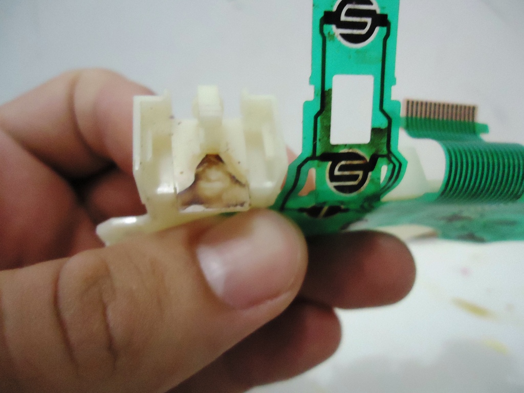 O DualShock, ao contrário de todos os outros controles de video games lançados até então, não fazia os contatos dos botões diretamente em sua placa principal, pelo contrário, era mais semelhante a teclados de PC nesse sentido. Há uma fina folha de plástico com contatos impressos, onde os botões podem fazer suas respectivas funções. A vantagem de se usar isso, é que o controle fica mais barato, leve e permanece compacto. A parte ruim da história, é que a folha de plástico é tão fragil que se sofrer qualquer coisinha... já era. Os contatos impressos tambem podem ser corrompidos com facilidade, seja pela ação de oxidação ou mesmo por simplesmente desgrudar do plástico. É por isso que toda vez em que se abre um DualShock deve-se tomar extremo cuidado com o plástico para não estragar nada ali. É preciso prestar bastante atenção na hora de desgrudá-lo daquela peça branca onde ele esta preso. E como recaia nele as minhas suspeitas de que estava nele o curto, fui com todo cuidado do mundo retirá-lo para ver como estava, e aí...