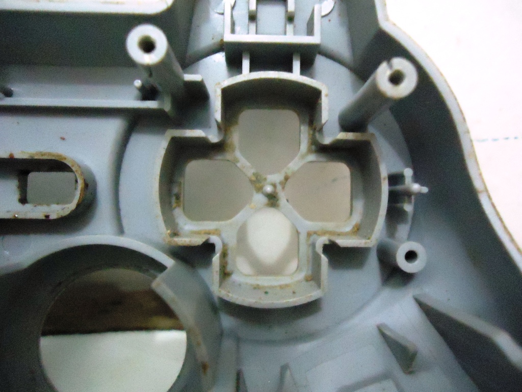 Lá estava o curto, bem no local onde fica o L2 e R2. Pelo jeito alguma coisa derramou ali e fez com que alguns contatos ficassem unidos=. O resto do plastico tambem estava bem sujo, com a mesma sujeira em vários outros pontos. Desmontei o controle por completo, e vi que tinha bastante sujeira acumulada onde os botões ficam: