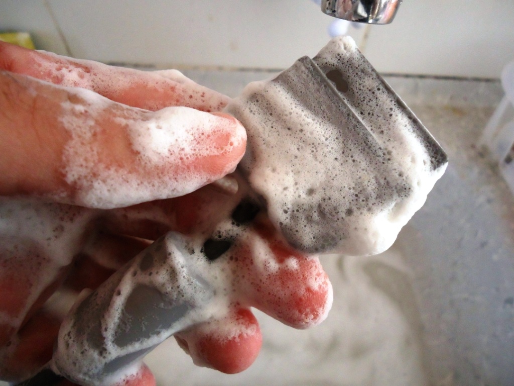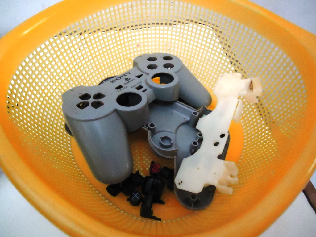 Aqui não tem mistério. As partes de plástico coloquei todas dentro de um escorredor, para não ter perigo de ver um botão descer pelo ralo, e lavei com bastante água e sabão, fazendo uso de esponja, escova e pincel para tirar a sujeira acumulada. Depois, deixei secar no sol mesmo, e em 5 minutos tava tudo sequinho sem nem um sinal de água. O plastico dos contatos tambem limpei com um pouco de água e sabão, a sujeira saiu toda e o mesmo voltou a ficar como novo (o curto foi pro espaço). O cabo do controle resolvi não limpar agora, pois com a plaquinha solta, aqueles motorzinhos poderiam acabar tendo os seus fios rompidos, então decidi deixar isso por ultimo. Mas agora tinha outra preocupação: os analógicos.