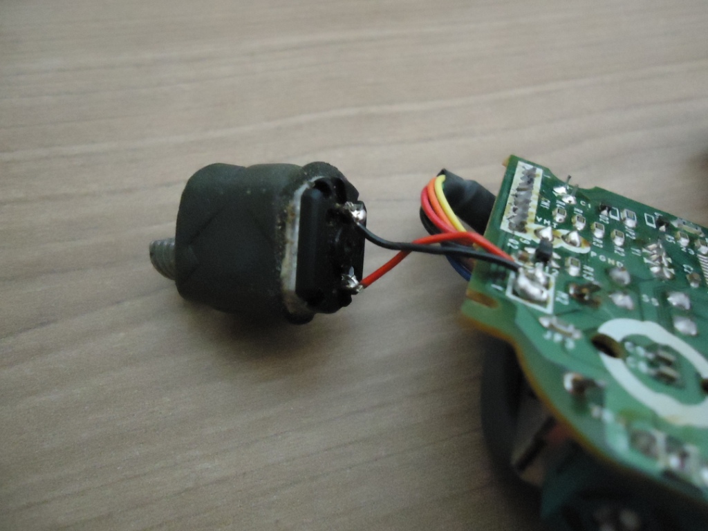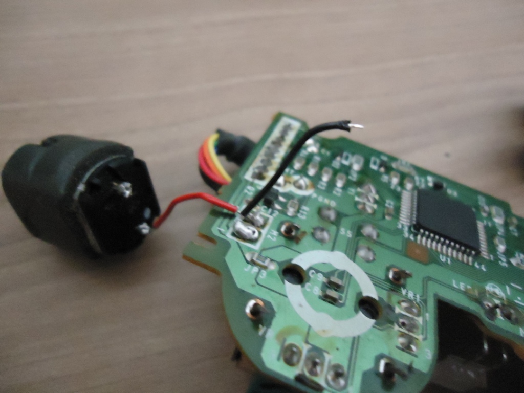 A primeira vista, nada de mais, tudo normal. Continuei desmontando o controle, tomando cuidado extremo para não romprer aqueles fiozinhos que ligam os motores que fazem o controle vibrar. Infelizmente vi que um deles já estava em um dos fios, mas não foi dificil ressoldá-lo no lugar: