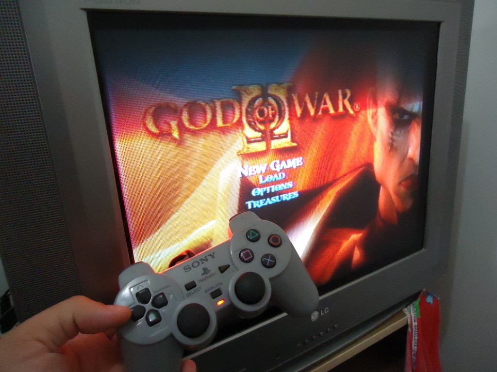Tudo limpo e maravilhoso, chegou a hora de testar. Como no momento só Deus sabia onde foram parar os meus jogos de PSX, resolvi testar no PS2 mesmo no meu recém adiquirido God of War 2, escolhi esse jogo pois nele se usa na prática todas as funções do DualShock: