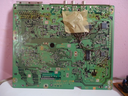 O estado fisico aparente da placa mãe estava muito bom. Nada de sujeira, nem bicho morto... só aquela poeirinha que sempre tem em qualquer lugar, e mesmo assim em pouca quantidade. O chip de desbloqueio (que na verdade não passa de um misero CI encontravél em qualquer canto) estava intacto, com todas as soldas no lugar e com os fios em boas condições. Não tentaram transcodificar esse video game, o que é ótimo! Afinal, jogar PSX em PAL-M é uma joça.