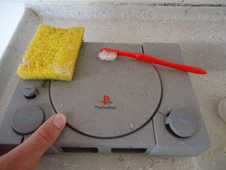 Agora vamos à lavagem. O plástico do PSX é poroso, o que dificulta um pouco a limpeza. Nesses casos, a melhor opção é utilizar uma escova com cerdas macias, sabão e bastante água. A sujeira costuma sair facilmente depois de umas boas esfregadas, e a escova facilita imensamente na hora de tirar aquela poeira que se acumula nas entradas de ar do console. Os botões tambem são limpos da mesma forma.