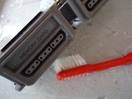 A porta de entrada dos controles e do memory card é formada por uma peça montada, e literalmente presa em uma armação com uma chapa de metal. É possivel desmontar tudo, porém não sem mandar pro espaço a chapinha. Portanto, limpei essa peça apenas superficialmente utilizando a escova e tomando cuidado para não cair água dentro (que sempre é um saco de tirar de lá depois). Tambem, não estava tão sujo assim, com algo que demandasse uma limpeza mais séria.