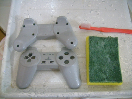 Primeiro, lave a carcaça do controle com bastante água e sabão. Use a parte macia da esponja para tirar as manchas de sujeira, a escovinha para limpar as reentranças, e a parte aspera da esponja use com cautela mas sem medo para remover a sujeira dos arranhos mais profundos. Sim meus caros, não ha sacrilégio algum nisso, usando a parte aspera da esponja, você pode retirar com facilidade toda aquela sujeira marrom que fica impregnada nos sulcos dos arranhos, pois usando apenas a escova, essa sujeira não irá sair nunca! Na foto abaixo dá pra ver com mais clareza o resultado desse processo de limpeza, principalmente no sumiço da sujeira na parte arranhada da traseira do controle, veja como ficou bem limpo.