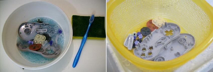 A limpeza não tem mistério. Só pegar uma escova velha, uma esponja, uma baciazinha, água e sabão, juntar as peças de plastico e borracha e jogá-las ali na água, e limpar com cuidado e atenção. Coisa de um Miojo (ou 3 minutinhos) e já tá tudo limpo. O cabo tambem pode ser lavado, desde que se tome cuidado para não molhar os conectores, que podem ficar com água acumulada. Para enxaguar as peças, recomendo que se use um escorredor de macarrão, pois quando se limpa tudo ali dentro da bacia, a espuma do sabão pode esconder alguma borrachinha ou botão, e o mesmo pode acabar indo pro ralo por acidente. Usando um escorredor, esse risco vai embora, e é possivel exaguar tudo sem perder vista de nada.