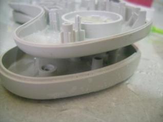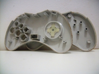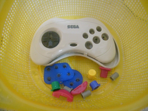 As larerais do controle estavam beeeeeeeeeeeem encardidas. Tinha uma sujeira escura ali (olhem a primeira foto), porém o controle em si estava perfeito por dentro, a plaquinha estava nova, as borrachas tambem... só o resto é que tava sujo mesmo. Separei tudo, coloquei as partes plásticas dentro de uma vazilha e lá fui limpar tudo.