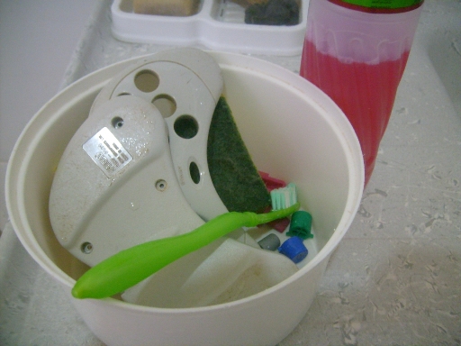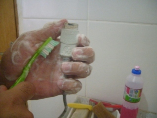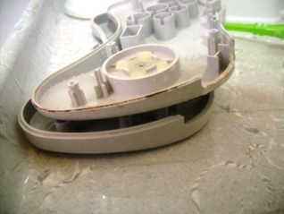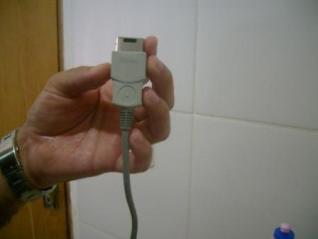 Agora faltava o cabo e o conector... precisei ser mais radical nesse ponto. Mergulhei o cabo e o conector dentro de uma bacia com água e sabão, tomando cuidado apenas para não molhar a placa do controle que é atarrachada ao cabo. Limpei o cabo com a esponja, rapidinho ele voltou a ficar num tom cinza claro. Já o conector... bem, ele teve uma conversinha com a parte aspera da esponja durante um tempo...
