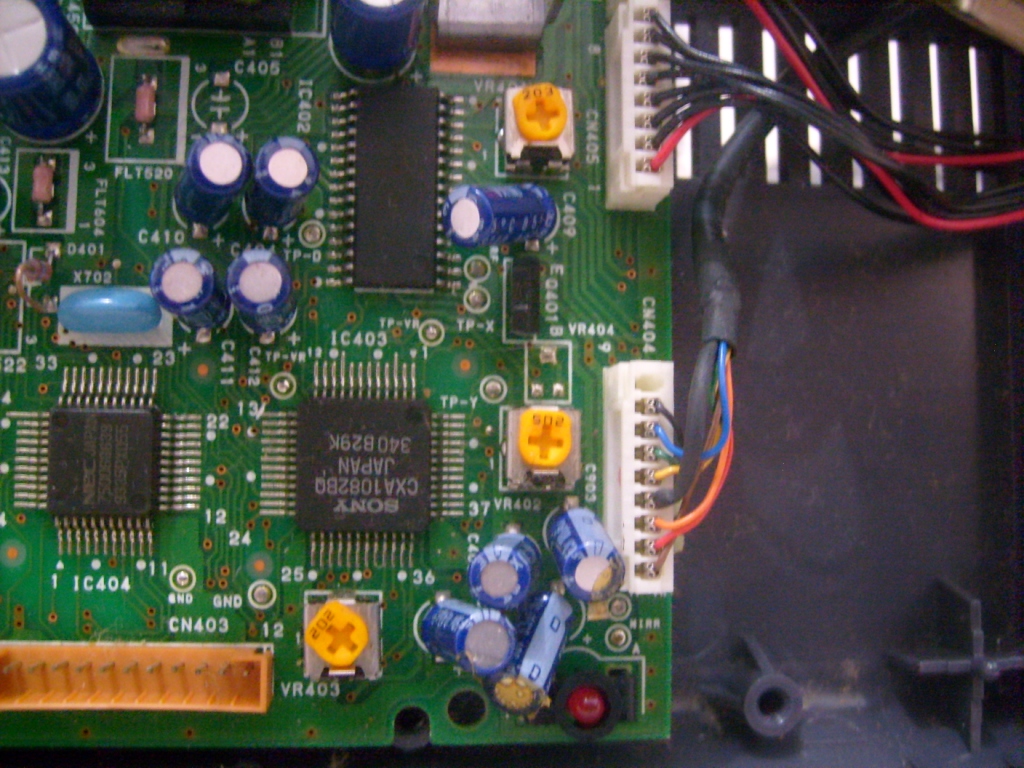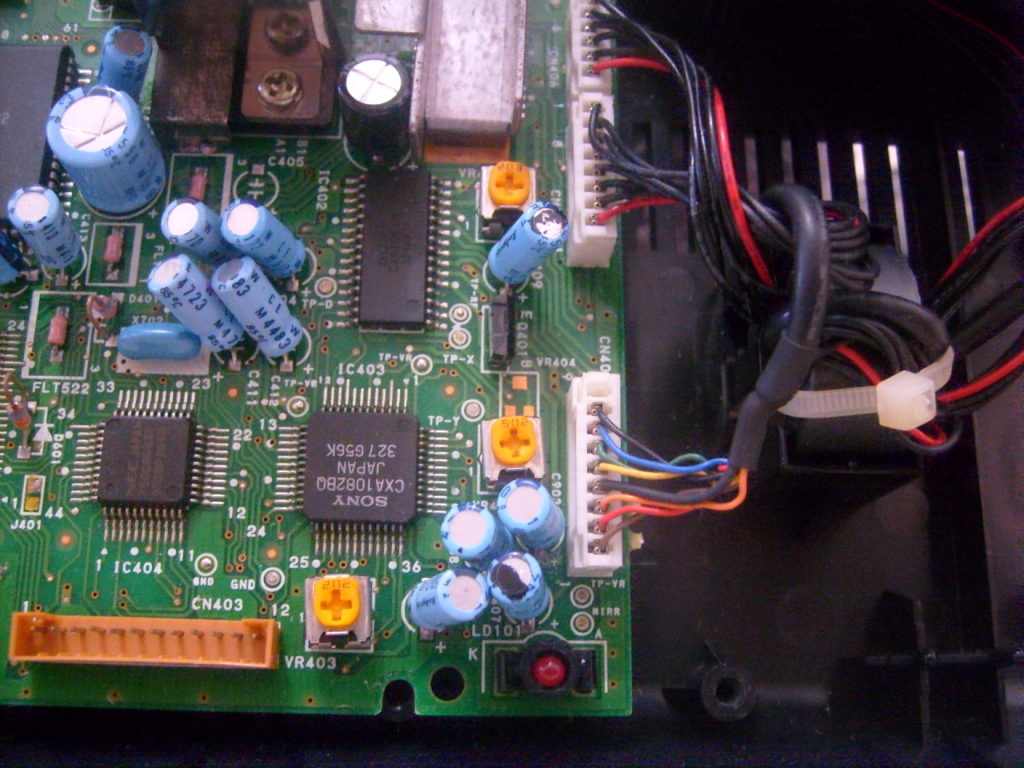 Esta foto é do Sega CD que está com o leitor ótico original. Repare como os trimpots ficam mais ou menos todos configurados para cima.